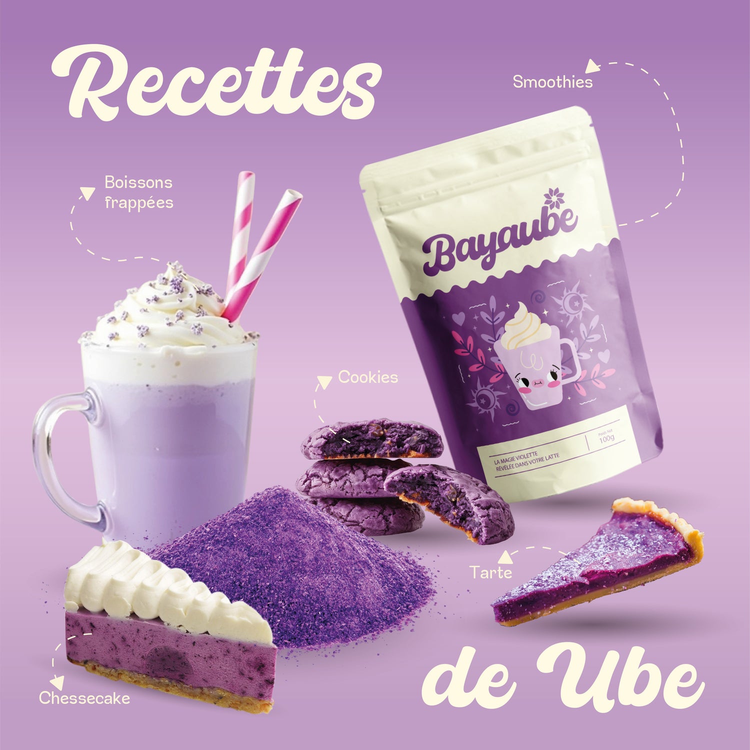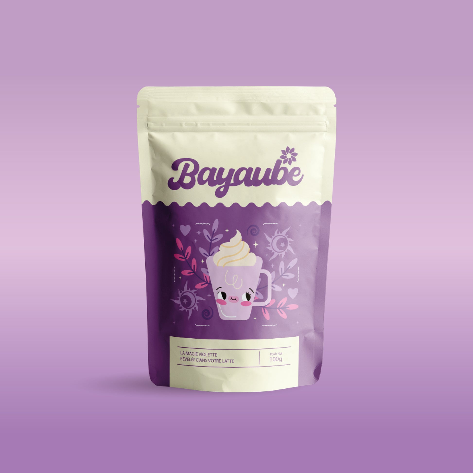Mélange quelques secondes — et c’est prêt.BAYAUBE, c’est l’ube instantané au goût authentique, à la texture veloutée et à la couleur violette éclatante.